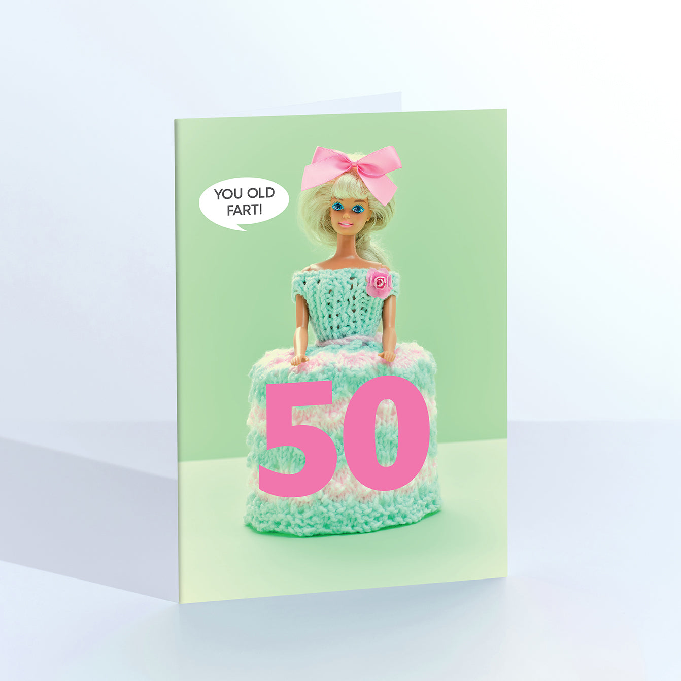 This humorous 50th Birthday greetings card features a photo art image of a vintage toilet roll doll in her hand knitted finery ready to celebrate the big 5-0!