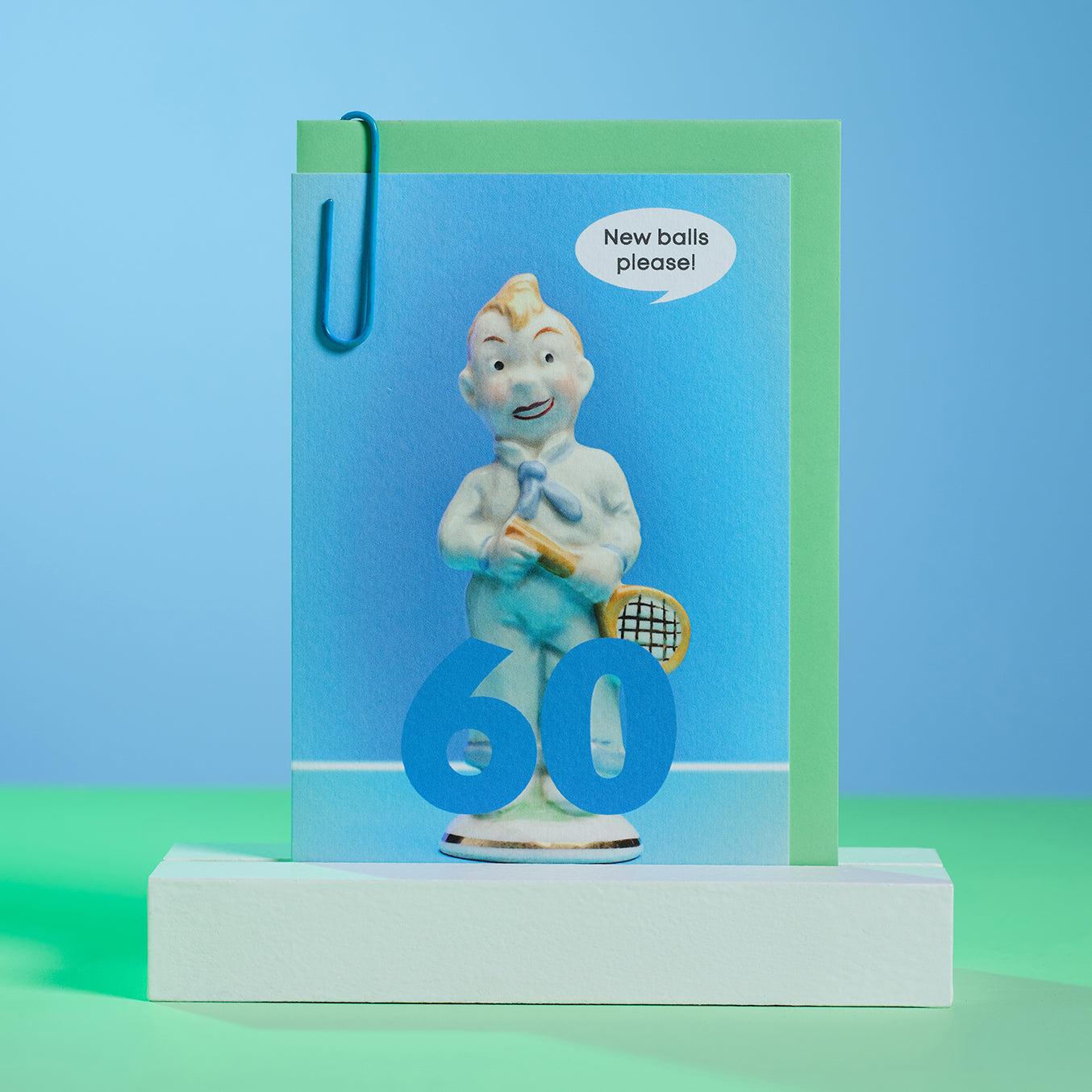 Helping them limber up for big 6-0? This champion of a 60th birthday greetings features a vintage ceramic player cheekily asking for "New Balls Please"