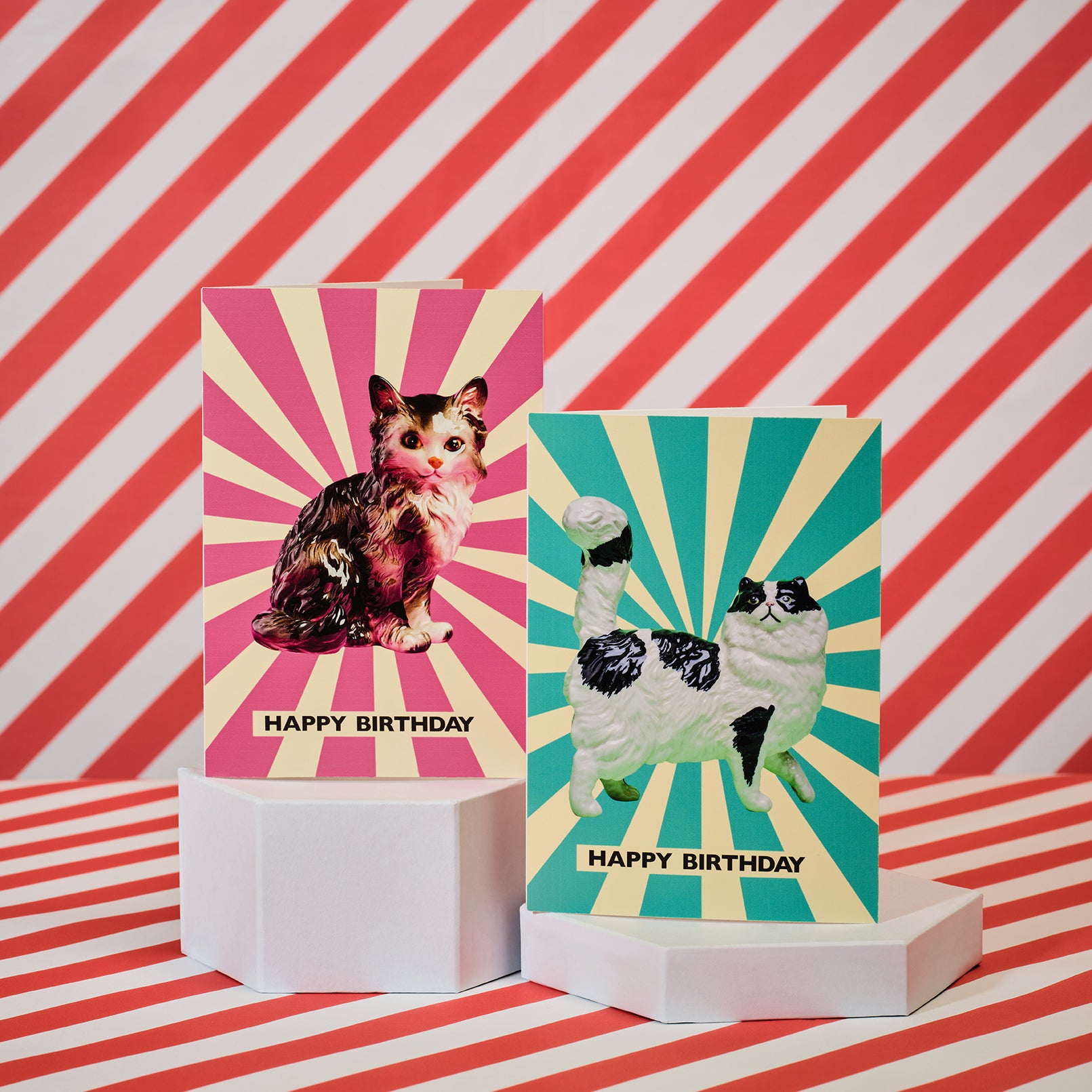 Inspired by retro circus posters this graphic turquoise card featuring a vintage ceramic persian cat sending "Happy Birthday" wishes is ready for posh-pawed celebrations.