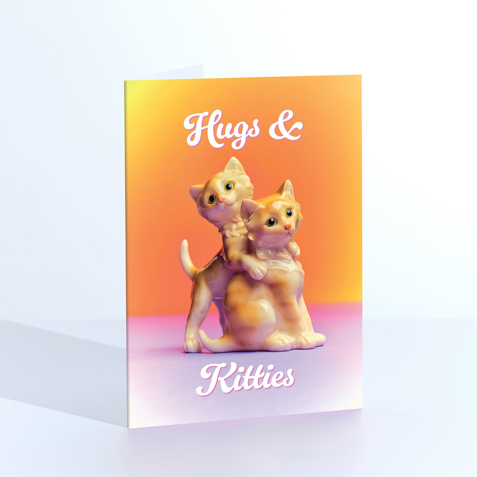 A pair of ceramic kittens cuddle up in this colourfully cute photo art greetings card.